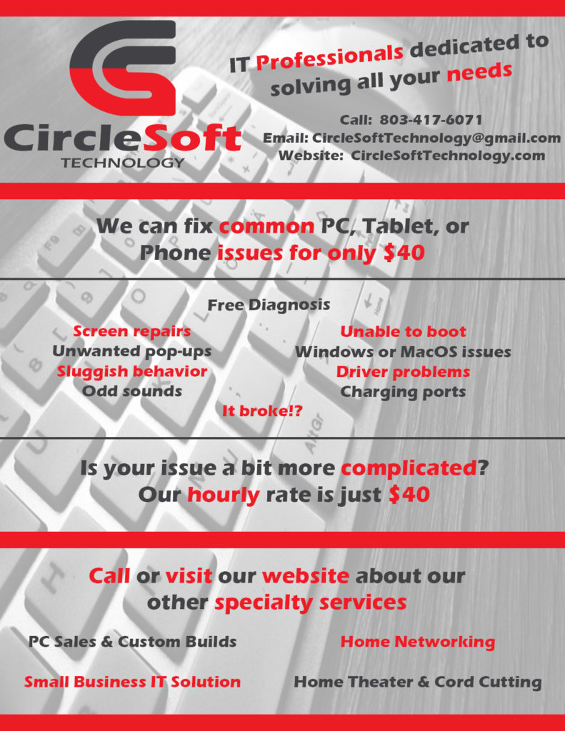 Taking his concerns to heart I created a flyer that spent half the real estate on PC repair. The other half was split evenly between branding and our specialty services. The focus line was placed about a third of the way down the page so a readers eye would be drawn to the price point.